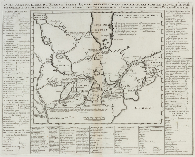 Engraved map of the Great Lakes and Mississippi River, image 362 x 457 mm (sheet 438 x 527 mm), matted and framed, printed within text borders. (Some very minor toning to edges and centerfold.) Later edition, the map after Lahontan's Carte Generale De Canada, with text describing Native American tribes in the region, as well as trade goods and values. Chatelain produced the map for his Atlas Historique, first published 1703-1719, and reissued in 1739. Kershaw 307.