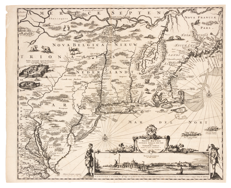 Engraved map, 466 x 553 mm image (sheet 482 x 593 mm). Figural cartouche incorporating view of "Nieuw Amsterdam op't Eylant Manhattan," canoes, animals, and a Native American fort. (A few short tears occasionally just touching image, some repaired on verso.)FIRST EDITION, FIRST STATE, before the names for Philadelphia and Pennsylvania were added, and before the course of the Delaware River is updated. According to Stokes, the first state of Danckerts' map depicts the same period as Visscher's map of the same title (1651-1655). Stokes describes numerous differences between Visscher and Danckerts' maps, and ultimately concludes "that the N. J. Visscher, in its earlier form at least, antedates the earlier Danckers." Burden dates the map later than Stokes or Tooley; he presents three possible periods during which this map could have been produced: the early 1660s, when Danckerts joined the family business and tensions were growing between the English and the Dutch; in 1666, following the death of Danckerts' brother; or following the recapture of New Netherlands by the Dutch in 1673. Burden believes it was likely produced in 1673, "as the first state is of some rarity, [and the second was not] produced until c.1684." EXCEEDINGLY RARE: Stokes cites only his copy ("no other copy of this state is known"), though he mentions that he "once saw one in the hands of a dealer"; we trace only one other copy in an institution (at Princeton University Library). No copies of the first state have appeared on the market at auction. Stokes Vol.I, pp.148-151; Tooley America, p.285 (first state).