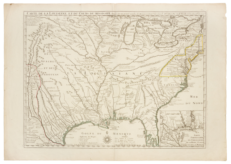 Engraved map of the Great Lakes and Mississippi River, with hand-coloring in outline, image 485 x 643 mm (sheet 558 x 757 mm). Inset of the Gulf of Mexico, New Orleans and Mobile. (Some very minor marginal chipping.) FIRST EDITION, second state (showing New Orleans) of "one of the most important mother maps of the North American continent" (William P. Cumming). Delisle's Carte de la Louisiane is the first detailed map of the Gulf of Mexico and the Mississippi River, and the first printed map to show Texas ("Mission de los Teijas etablie en 1716"). The Missouri River is named three times, and extends west to the upper Rio Grande. Tooley 43; Wheat Transmississippi 99.