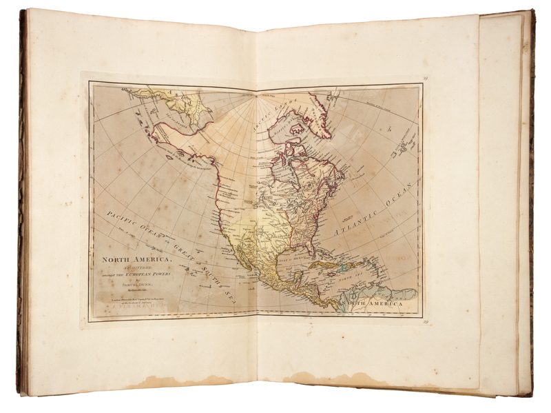 Folio (475 x 290 mm). 6 engraved double-page cosmographical charts and tables, 42 double-page maps with hand-coloring, numerous engraved diagrams in text, all mounted on stubs. (A few maps with tears along fold crossing image, a few additional short tears occasionally crossing image, dampstain to lower margin, some occasional spotting or staining.) Contemporary half calf, marbled boards, red morocco lettering-piece gilt (endpapers and covers detached, some light wear). FIRST EDITION. Dunn published three editions of this work between 1774 and 1789. After his death, Robert Sayer took over the publication, and later, it was taken over by Laurie & Whittle; each updated and improved the work to include the latest information. Phillips 3515.