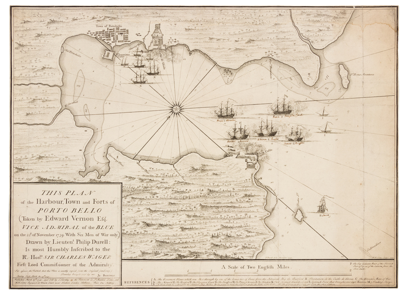 Engraved map, image 430 x 586 mm (sheet 433 x 588 mm). (Trimmed close to neatline, a few pale stains.) FIRST EDITION, depicting the Battle of Porto Bello between Britain and Spain during the War of Jenkins' Ear and the Austrian Succession. Vice Admiral Edward Vernon took the port and town of Porto Bello, an important transfer point for gold and silver from South America for the Spanish, with a small fleet of just 6 ships in November 1739. The chart depicts the 6 ships, and contemporary manuscript notes name the ships and captains who fought in the battle, including Commodore Brown, Robert Herbert, Perry Mayne, and T. Trevor. RARE. (See lot 103 for a map of America published by Thomas Bakewell, 1740, including a rare inset of the Battle of Porto Bello). Prichard & Taliaferro 25.