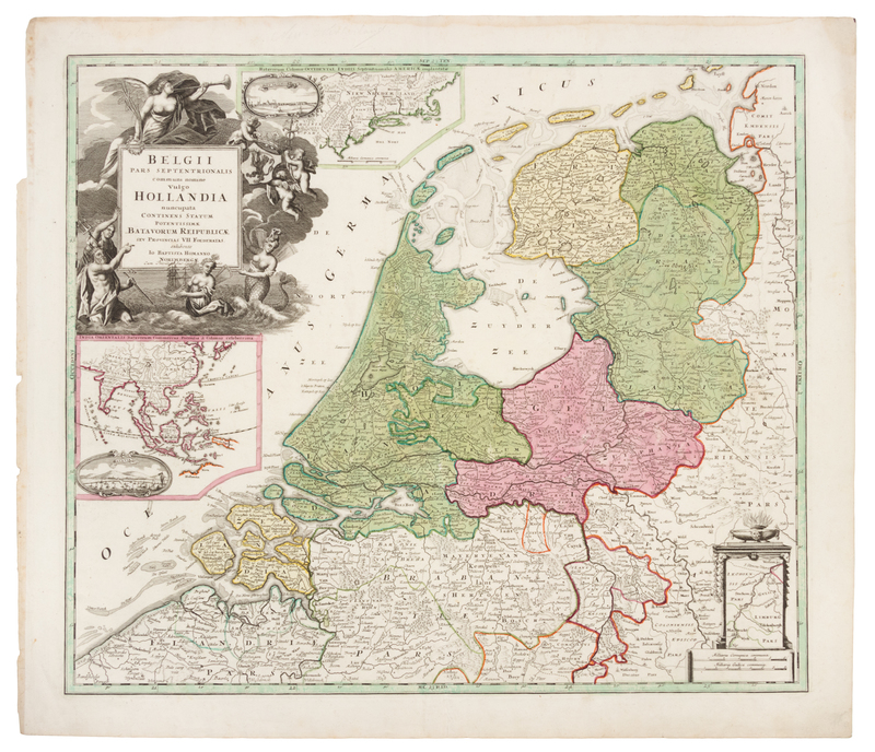 Engraved map, hand-colored in outline and wash, image 477 x 554 mm (sheet 540 x 616 mm). Elaborate decorative cartouche depicting Triton, mermaids, and putti, inset of Niew Neederland with a view of New Amsterdam, inset of India with a view of Batavia, inset of the Maas River valley. (Mounting strip remnant lower margin verso.)