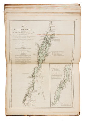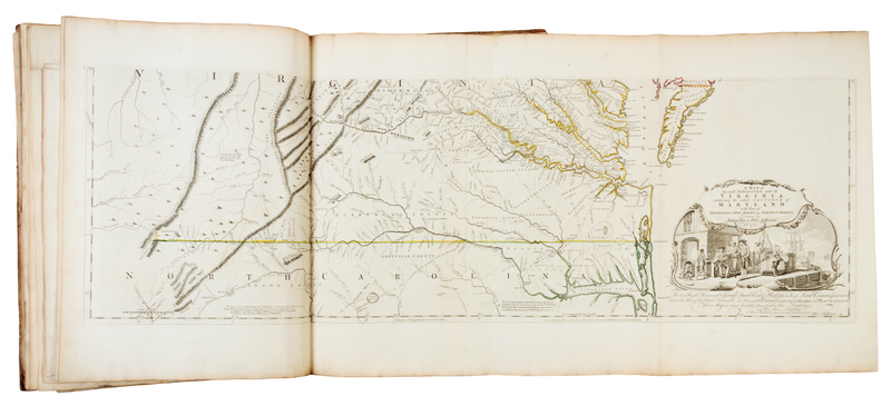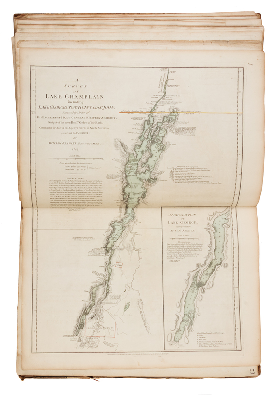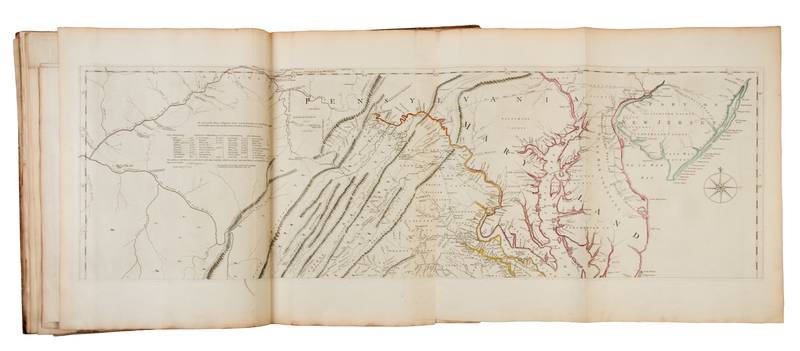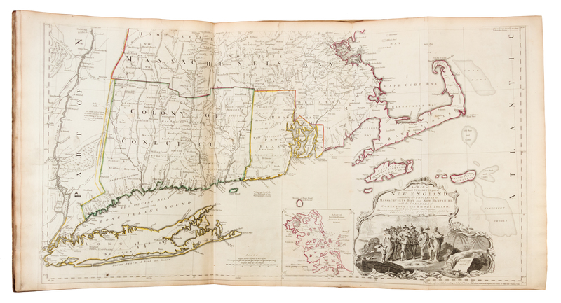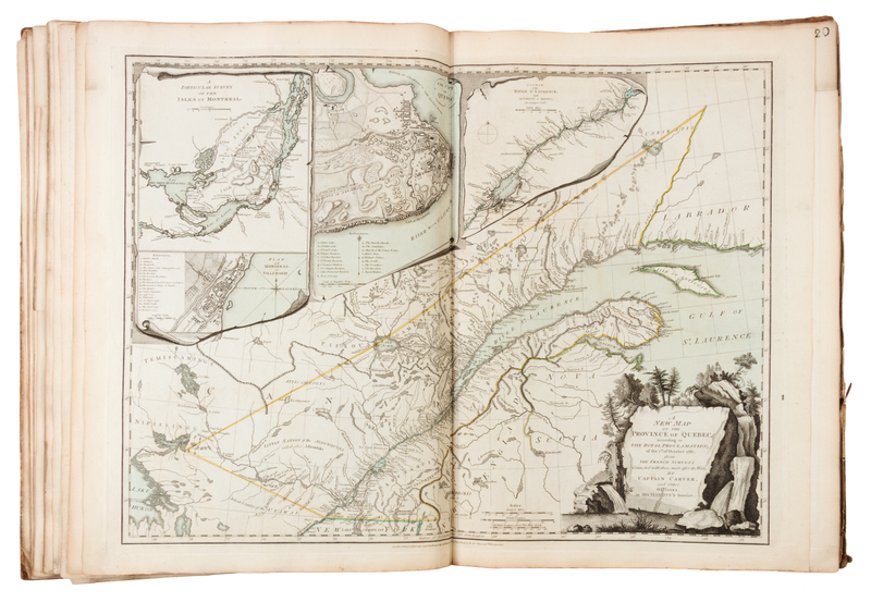 Folio (562 x 411 mm). Letterpress Index leaf (listing 30 maps), 23 maps on 30 sheets (most double-page or folding), hand-colored in outline, all mounted on guards. (Several maps, including the Bowen map of North America [5-6], Mouzon's map of North and South Carolina [22-23] and Holland's map of New York and New Jersey [17], with right margins darkened & frayed with minor loss; some other minor marginal chipping or wear; some sheets darkened and frayed slightly at margin edges; occasional light soiling, discoloration or breaks at folds.) Contemporary half calf (worn, covers detached). The American Atlas has several editions dated 1776. This copy with the second title-page mentioning 49 plates and with Holland's name listed as a major, and the letterpress index listing 30 maps (the first index lists 29 maps). There are various combinations of maps included in the several 1776 editions which were made up. Each map has an ink-numbered stamp on the upper righthand verso. Bowen & Gibson's "An Accurate Map of North America," numbered 5-6, is an earlier issue, with imprint dated July 2, 1775 (Stevens & Tree 49d). Map 8, British North America, was originally dated 1775 and was revised here to Aug. 17, 1776. The New York and New Jersey map; map 17, was likewise originally dated 1775 and now revised to Aug. 17, 1776 (when its number was changed from 18 to 17). This copy might be an earlier issue with Carver's map of the province of Quebec here numbered 18, prior to it change to number 19 when the Champlain map was added. (This copy includes the map of Lake Champlain in its first state, loosely inserted.) Scull's map of Pennsylvania was previously number 17, but is here number 19. The present edition includes A new Map of the Province of Quebec in place of Jefferys' map of the Middle British Colonies.