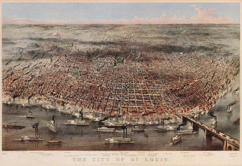 The City of St. Louis. Lithograph with hand-coloring, 1874, image 578 x 828 mm (sheet 720 x 1101 mm), on wove paper, with margins, old mat burn, some light overall spotting or browning, a few short marginal tears, matted and framed.