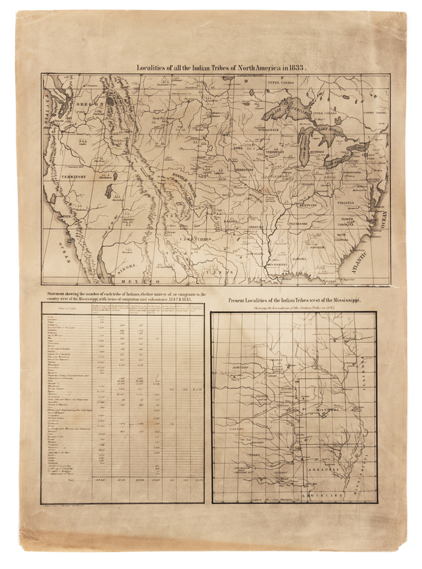 2 lithographic maps printed on a single sheet, (sheet 532 x 385 mm). Overall view of the United States and a detail of Missouri, Arkansas, and parts of Illinois and Louisiana. (2 -in. tear crossing image, a few short marginal tears or creases, some spotting and browning.) The only maps to appear in History of the Indian Tribes of North America, the top map marks the locations of all of the Native American tribes with a tepee symbol, and the lower chart and map describe the forced migration of tribes after the 1830 signing of the Indian Removal Act.
