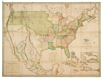 Engraved folding map by J. Vallance and H.S. Tanner, overall 915 x 1490 mm, hand-colored in outline, dissected in 50 sections and mounted on linen, green selvage, marbled paper outer panels, image 883 x 1447 mm (915 x 1490 mm sheet). (Some light fraying to selvage, a few pale stains.) Cloth folding case. THE THOMAS W. STREETER COPYThird state (Martin/Ristow) of the 1820 edition. The first state consists of only the southeast sheet with cartouche; the second state is the first state of Melish's map to be published from nine plates. The third state differs from the second only in the date in the copyright notice, which reads "16th day of June" rather than "6th day of June." According to Streeter, "the only obvious difference between the June 6th and June 16th maps is in the coloration." The 1820 edition is larger than prevoius editions; Melish extends the southern boundary to 16N (from 2250'N) to include the Yucatan peninsula, as well as the Caribbean islands. The northern boundary of Tennessee is shown along 3630' for the first time, following Congress's ratification on 12 May 1820. The depiction of Lake Michigan and the borders of Illinois and Indiana are also corrected to include Chicago within the Illinois state boundaries. Missouri appears as a Territory separate from the Arkansas Territory. SCARCE: In addition to Streeter's two copies of this edition of Melish's map, we trace only two copies sold at auction in the last 40 years which have reappeared several times. Ristow John Melish and His Map of the United States, p.174; Streeter VI:3809 (this copy).