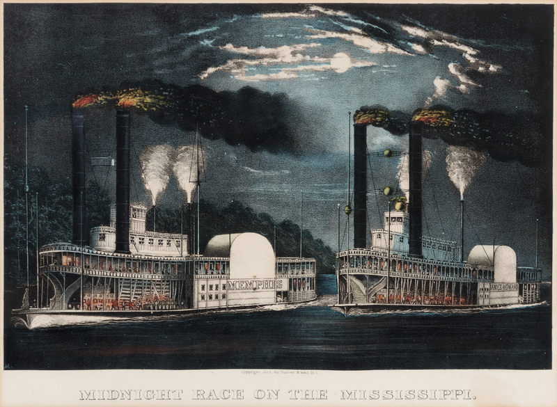 A Midnight Race on the Mississippi. lithograph with hand-coloring heightened in gum arabic, 1875, image 235 x 334 mm (sheet 344 x 447 mm), on wove paper, with margins, pale mat burn, one marginal wormhole, a few marginal pinholes, short marginal tear lower left margin, matted and framed.