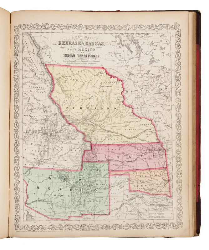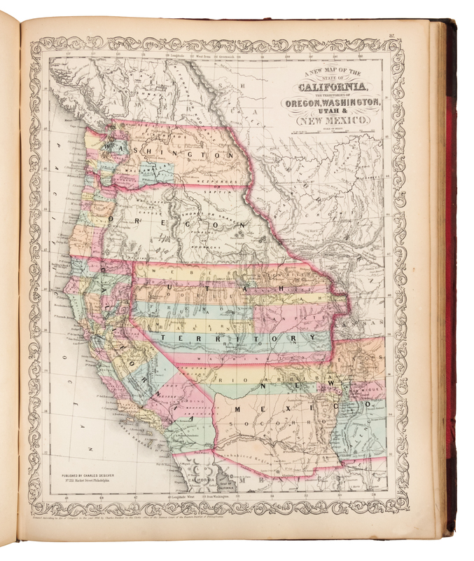4to (438 x 356 mm). Lithographic title-page, 76 lithographic maps with hand-coloring (3 double-page). (A few pale spots.) Publisher's half red morocco, morocco lettering-pieces gilt for title and the name of the first owner to upper cover (upper hinge repaired, joints starting, some overall wear or stains). Second Desilver issue of the Mitchell atlas, with 33 maps relating to the United States. The map of the United States shows the territory gained through Gadsden Purchase of 1854. Phillips 823; Rumsey 2514.