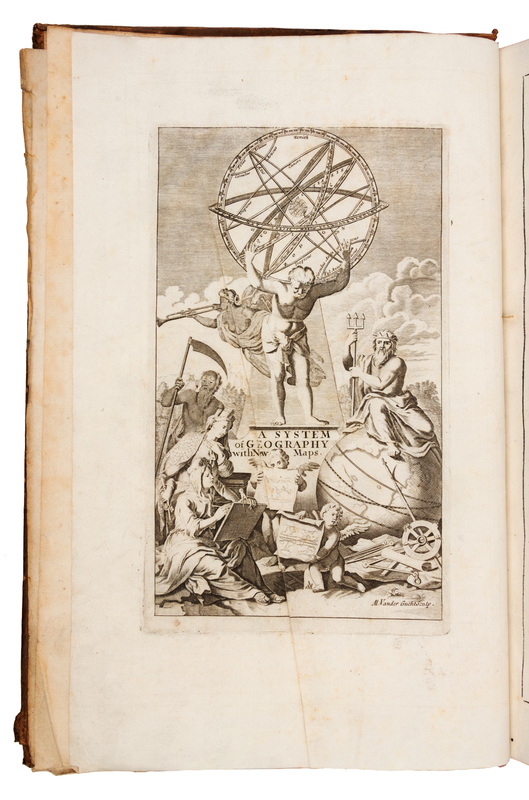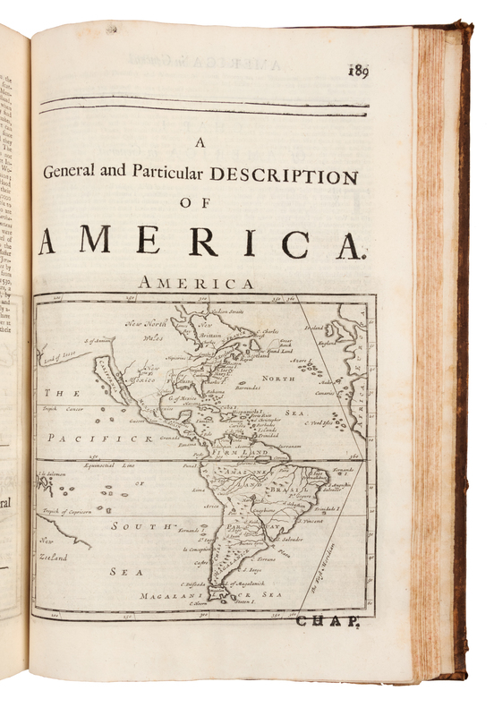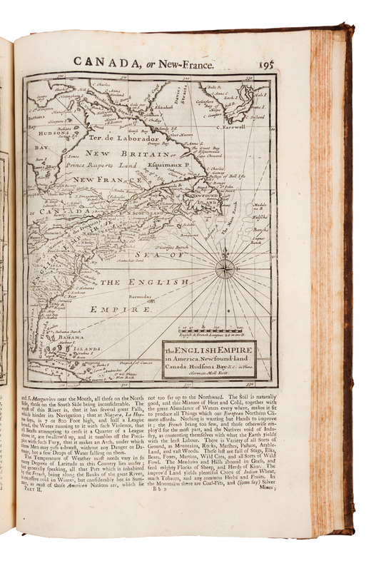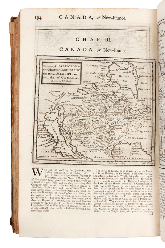 2 parts in one, small folio (345 x 220 mm). Engraved frontispiece afer M. Vander Gucht, title printed in red and black within a double rule border, numerous woodcut and engraved diagrams, 42 engraved maps in text. (Lacking 23 leaves, some minor offsetting.) Contemporary calf gilt, edges sprinkled red (some wear, joints starting).Fourth edition. "Moll published a beautiful little map of 'The Isle of California, New Mexico, Louisiane, The River Misisipi, and the Lakes of Canada,' on which he crowded a vast amount of information -- as well as much misinformation" (Wheat). ESTC T114016; McLaughlin 173, 144 , 143; Wheat Transmississippi 81, 109. Sold as a collection of maps not subject to return.