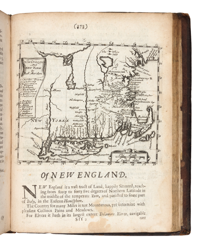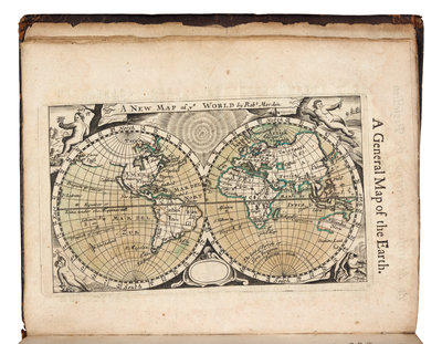 Small 4to (200 x 157 mm). Title printed in red and black, hand-colored engraved double-hemisphere map of the world, 63 engraved maps in text (6 with hand-coloring). (Without preliminary leaf with "A catalogue of the maps in this book" on verso, some browning or spotting.) Contemporary calf , later brown morocco lettering-piece gilt (upper cover detached, lower joint starting, some overall wear).FIRST EDITION, the title-page and Sabin calling for 60 maps, but this copy with 64, as called for in the "Catalogue" (lacking in this copy); the maps relating to the Americas are all in Burden's FIRST STATE. Morden advertisd his first atlas, the Geography Rectified, on 29 April 1680. He "had previously been in collaboration with others, largely publishing individual maps of some considerable merit...Here the maps are simple in form but are attractively engraved. A study of them indicates the possibility that the plates were engraved by Herman Moll" (Burden). RARE: according to American Book Prices Current, only 2 complete copies of this work have sold at auction in the last 40 years. Burden 519-524; ESTC R214230; Sabin 50535.