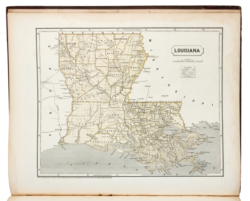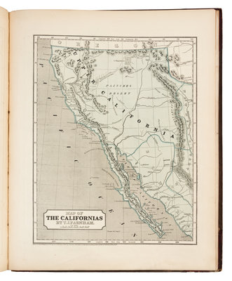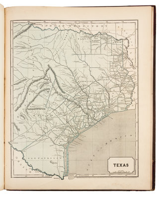 Folio (442 x 356 mm). 36 chromolithographed maps. (A few leaves with marginal dampstaining, a few other minor stains or soiling.) Publisher's half red roan, brown floral cloth, gilt-stamped (joints starting, spine perished, some light wear). Second edition, including maps of North America, Canada (east and west), Nova Scotia-New Brunswick, West India Islands and Wisconsin Southern Part not included in the first edition. This copy with no map of Oregon and no separate map of Iowa (as issued). The map of Indiana is dated 1843 (rather than 1842 as called for in Phillips); the separate map of Wisconsin is entitled "Wisconsin, southern part" and is dated 1844 (the Library of Congress copy map of Wisconsin is dated 1845, and is entitled "Wisconsin, southwestern part"). Phillips 1228; Rumsey 2301.