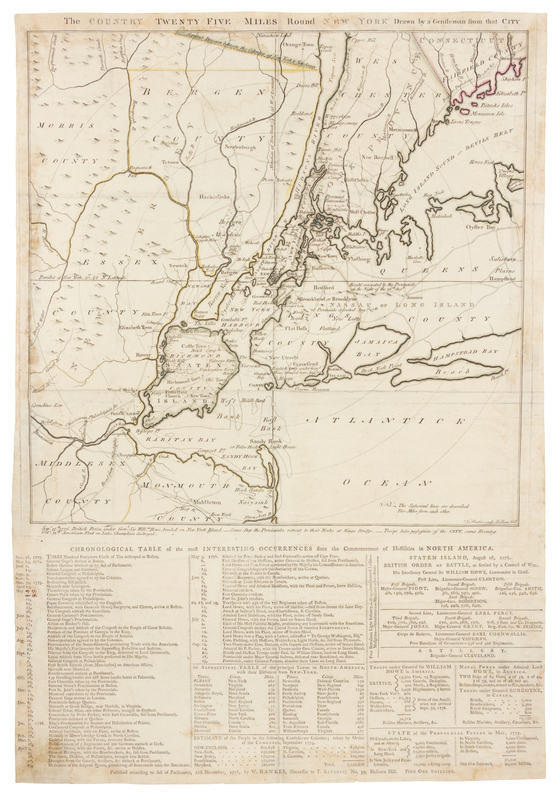 Broadside, sheet 588 x c.410 mm (23 1/8 x ca 16 in.), plate 395 x 405 mm (15 7/8 x 15 1/2 in.). Engraved map by J. Barber ("J. Barber sculp Holborn Hill"), lightly hand-colored in outline in yellow and green, signed in the plate With letterpress text printed on same sheet below in three columns headed: "Chronological Table of Most Interesting Occurrences since the Commencement of Hostilities in North America." (Left margin unevenly trimmed, some minor soiling, several paper repairs and mounting remnants on verso with minor discoloration, a few very pale dampstains.) The Chronological Table begins with the mention of what would later be known as the Boston Tea party on December 16th, 1773 ("Three Hundred Forty-two Chests of Tea destroyed at Boston"). And proceeds to recount the events of the war itself, most notably the Battle of Bunker Hill outside Boston ("Action on Bunker's Hill"), and the British evacuation of Boston on March 7th, 1776. The text beside the date July 4th, 1776 reads: "General Congress declare the United States of America Independent." The events over the summer include Howe's landing on Long Island on August 22nd, Sullivan's defeat on August 27th ("Provincials under Major General Sullivan, defeated near Brookland, on ditto"), and end on August 29th "Provincials, under General Putnam, abandon their Lines on Long Island." The text section also provides a great deal of important information including an "Alphabetical Table of the Principal Towns in North America and their Distance from New York," a table listing the population statistics of the various American colonies, and information regarding the command structure, troop strength, and the general disbursement of both the British and American forces. AN EXCEEDINGLY RARE BROADSIDE MAP DOCUMENTING THE DRAMATIC EVENTS UNFOLDING DURING BRITAIN'S NEW YORK CAMPAIGN AT THE OUTSET OF THE REVOLUTIONARY WARThis early state is dated 21 November 1776 in the imprint and contains an extra engraved line beneath border of the map bringing the information down to Oct. 13th. It is unrecorded among the four listed in Stevens & Tree, which describes the first state dated 1 November 1776 and bearing a single engraved line beneath the border of map which begins "Sept. 15. 1776 British Forces", the second issue he lists is dated 21 November 1776 and contains an extra engraved line beneath border of map bringing the information down to November 1, 1776; the third state has imprint dated 1 January 1777; and the fourth state was published by R. Sayer & J. Bennett 2 June 1777 and with the two engraved lines bringing information down to 16 November. Reese offered the third state in Catalogue 273, item 86. Nebenzahl mentions the present state as being between Stevens & Tree 43a & 43b. Nebenzahl 110; see Stevens & Tree 43; see Streeter II:786 (43d later issue).