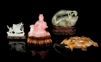 comprising a spinach jade duck, an agate brush washer, a rose quartz figure of a seated Guanyin and a jadeite model of a boat.