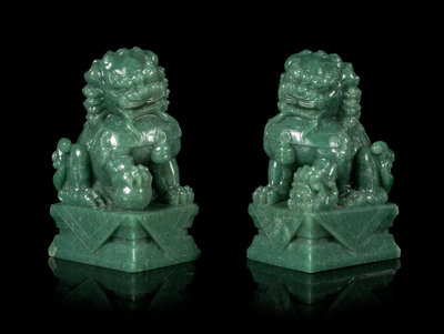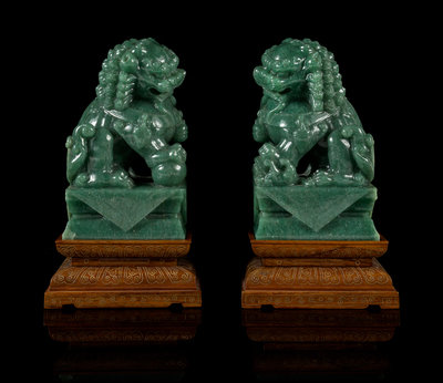 A Pair of Chinese Green Jade Figures of Fu Lions