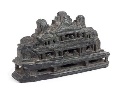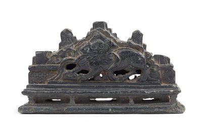 in the form of a mountain, carved to one side showing two fu lions, the reverse with three pagodas with figures, all raised on a reticulated stand.