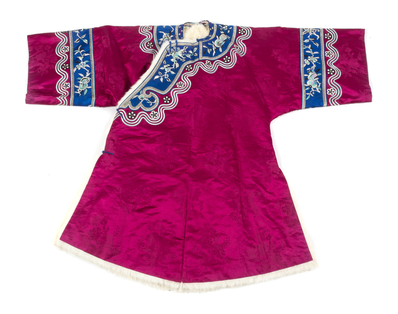 embroidered with floral patterns against a ruby-red ground, the interior with a fur lining.