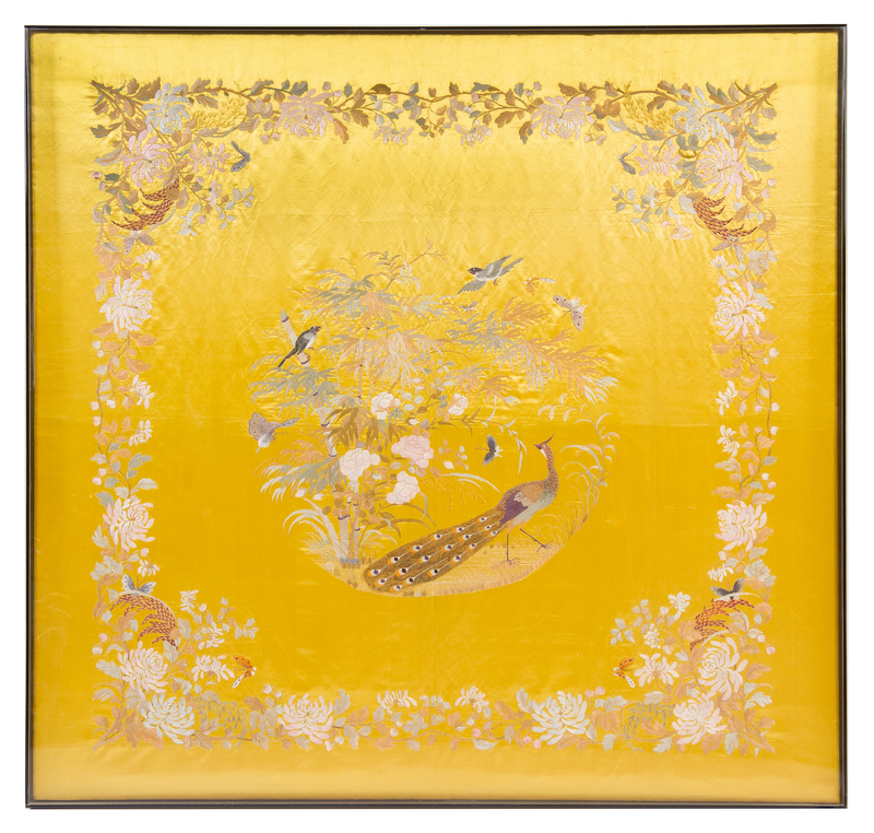 of large square form, worked in multi-colored threads depicting a central medallion with birds amongst flowering branches, enclosed by a border of floral scrolls, set above a bright yellow ground, framed.