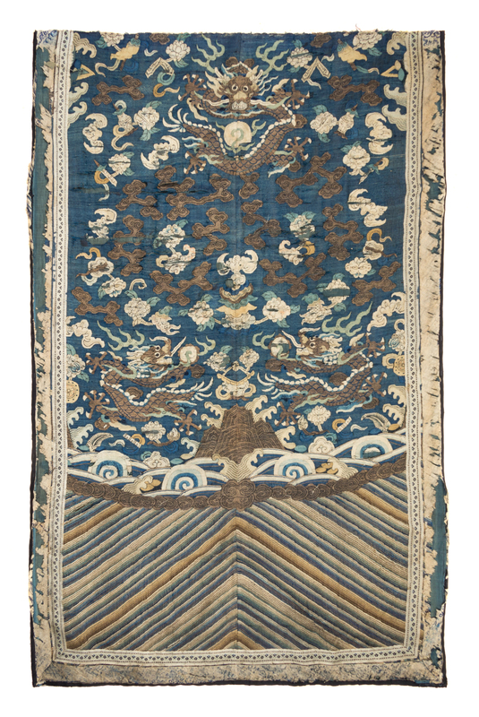 of rectangular form, depicting a sinuous dragon to the upper register chasing the flaming pearl of wisdom, above a pair of crouching dragons with flaming pearls amongst ruyi clouds, flying bats and ribbon-tied Buddhist emblems, all picked out on a celeste blue ground and above mountain peaks, rushing waves and lishui.