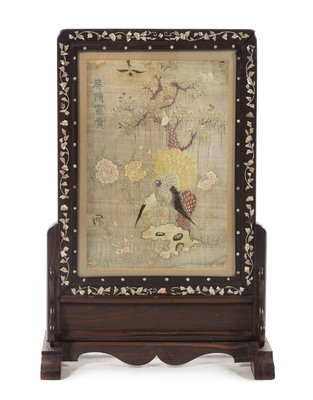 A Chinese Embroidered Silk Panel Inset Table Screen