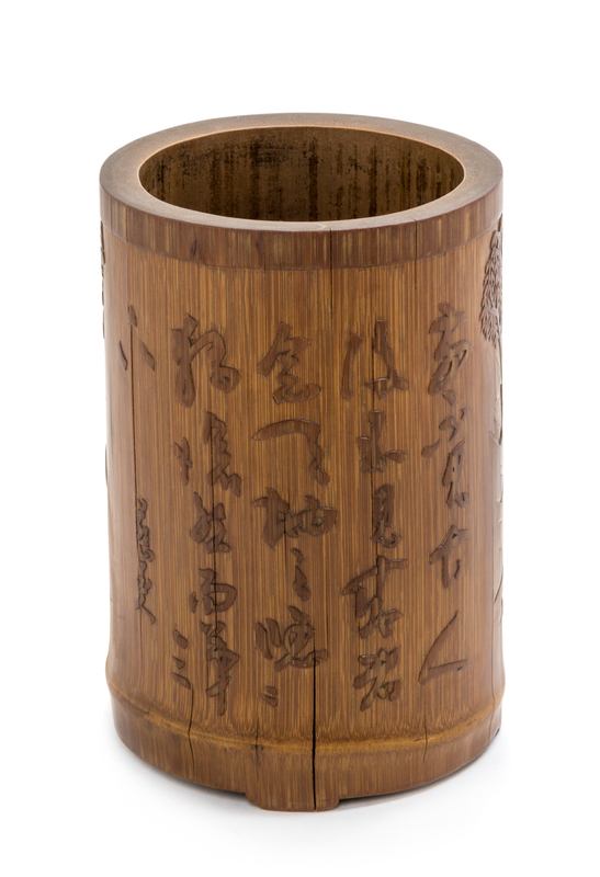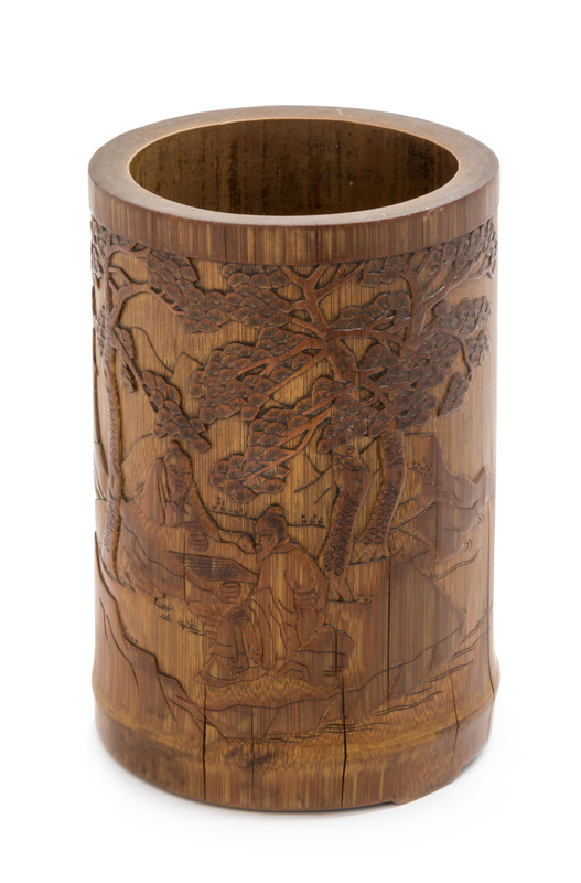 of cylindrical form, the exterior carved to show two scholars playing chess underneath pine trees in a mountain setting, followed by inscriptions.