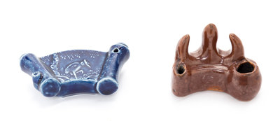 the first a blue glazed ink stand in the form of an open scroll, the second a brown glazed mountain-form brush rest.