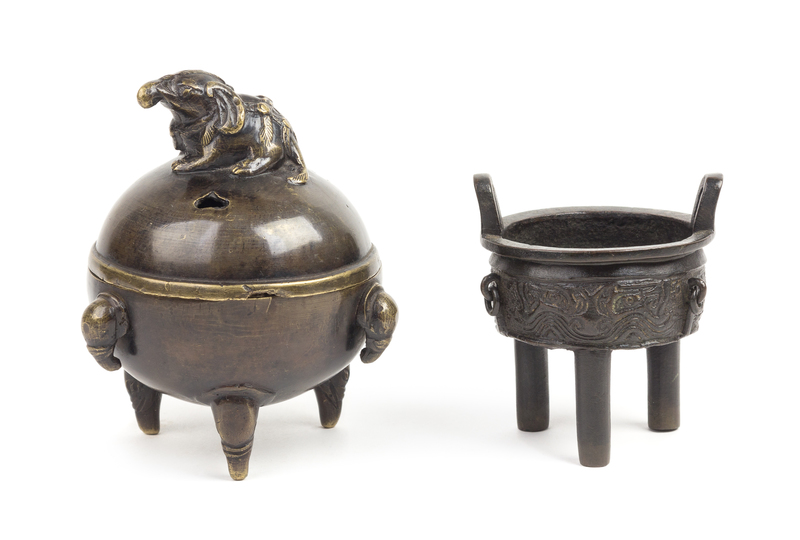the first having a globular body raised on three tapering feet, cast with three elephant head-form handles, the dombed cover surmounted by a finial in the shape of a recumbent elephant; the second raised on three cylindrical feet, set with a pair of upright handles, the body decorated with archaic designs.