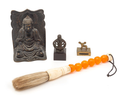 comprising a Chinese brass figural matchbox, a calligraphy brush, a single bookend and a metal figure.