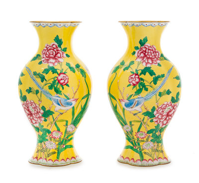 each having a baluster body surmounted by a flared mouth, painted overall to depict birds perched on flowering peony branches, set above a bright yellow ground.