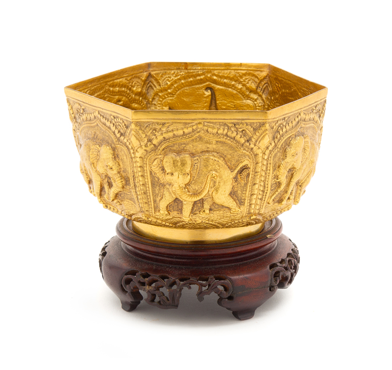 of hexagonal form, chased with elephant figures, raised on a hardwood stand.