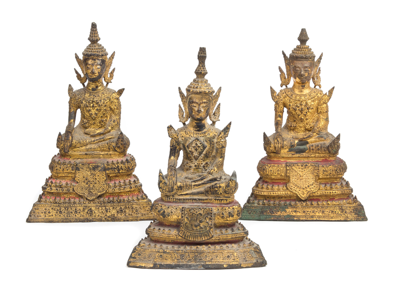 each figure depicted seated on tiered throne in dhyanasana, dressed in elaborate robes and wearing a tall headdress.