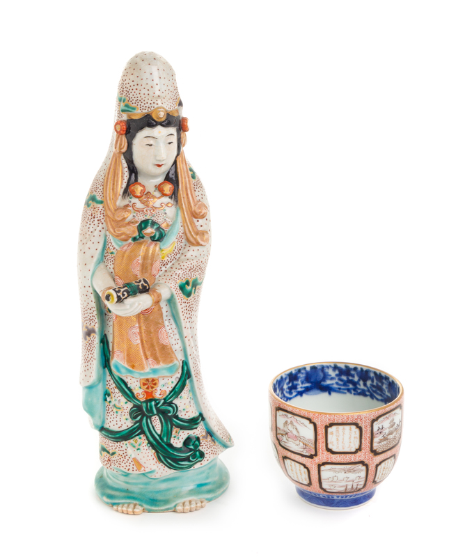 comprising a figure of a standing Kannon, and a cup with landscape decoration.