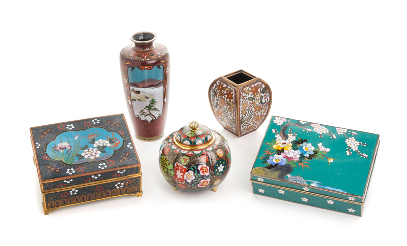 comprising two vases, one covered jar and two rectangular hinged boxes.