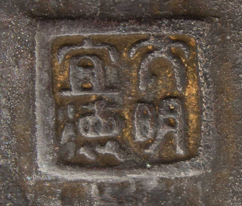the first a rectangular jardiniere cast with birds and bamboo decoration, having a pair of upright handles, the underside cast with an apocryphal Xuande four-character mark within a square; the second a covered box shaped as a fan.