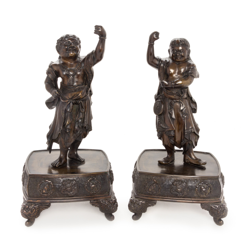 A Pair of Japanese Bronze Guardian-Form Candle Holders