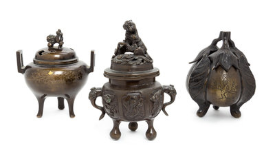 the first having a compressed globular body, with silver inlaid chrysanthemum decoration, the reticulated cover surmounted by a seated shishi; the second with a baluster form body, cast with alternating quatrefoil panels enclosing birds and flowering branches, flanked by a pair of dragon head-form handles; the third of melon form with a leafy vine forming the cover, the underside cast with an apocryphal Xuande four-character mark.