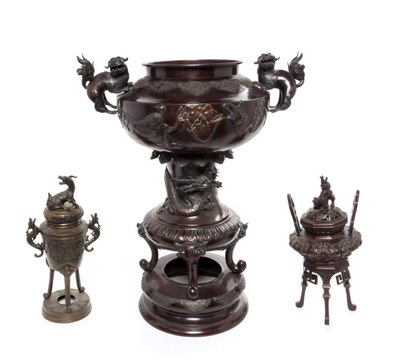 the first having a compressed globular form body chased with flowering prunus, flanked by a pair of fu lion form handles; the second of compressed form having a pair of upright handles, the domed cover surmounted by a shishi-form finial, the third of tapering cylindrical form flanked by a pair of dragon form handles.