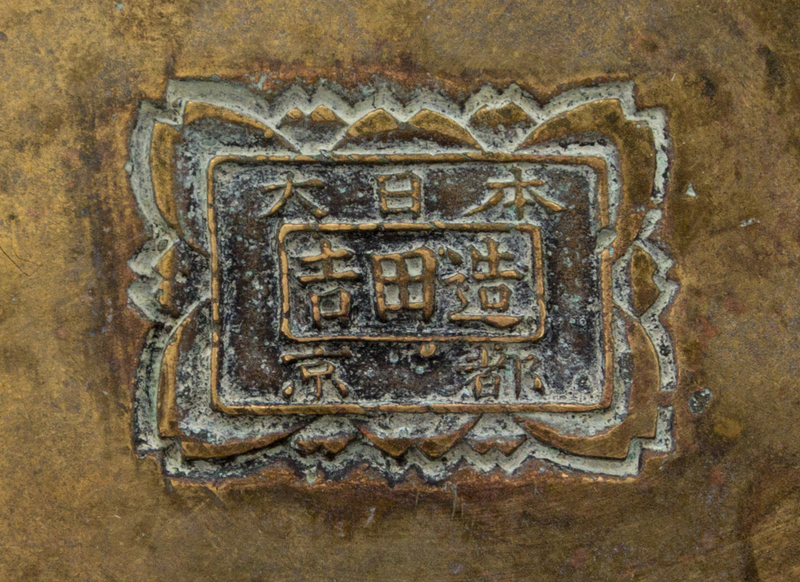 the larger pair each of tapering cylindrical form, resting on a tiered base, surmounted by a dished mouth, chased with flowering chrysanthemum decoration; the smaller pair each of baluster form raised on a splayed foot, decorated with a landscape scene.