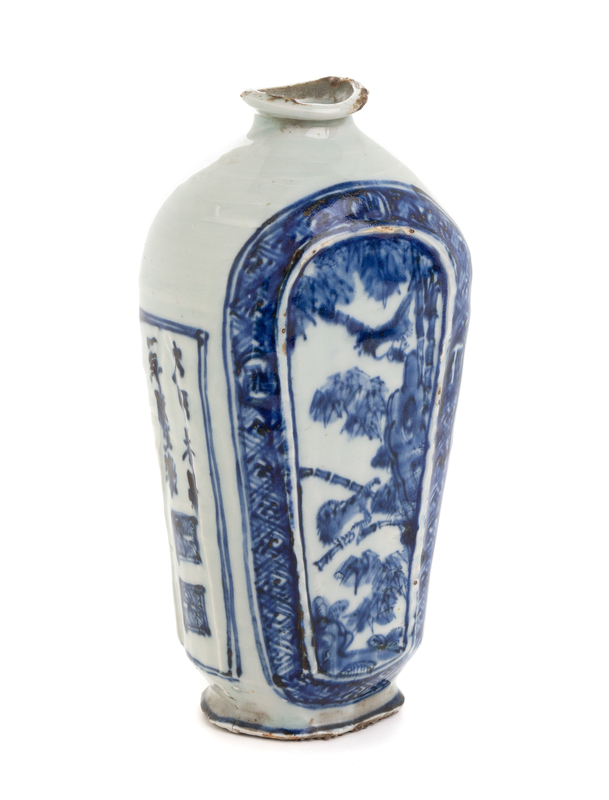 the tapering body decorated with trees and inscriptions.