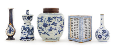 comprising a blue and white ginger jar with a hardwood cover, a blue and white bottle vase with dragon decoration, a candle holder with decoration, a gilt decorated powder blue ground and underglaze blue bottle vase with bogu motif and a blue enameled square brushpot with inscriptions.