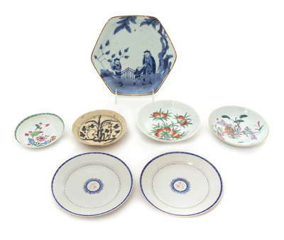 comprising three famille rose examples, two blue and white examples and one blue enameled examples.