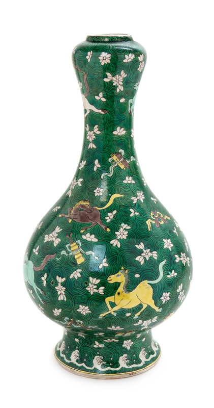 the pear shaped body raised on a tall splayed foot, surmounted by a tall neck and a garlic-form mouth, painted to depict various striding horses and ribbon-tied Daoist emblems interspersed with white flowerheads above swirls.