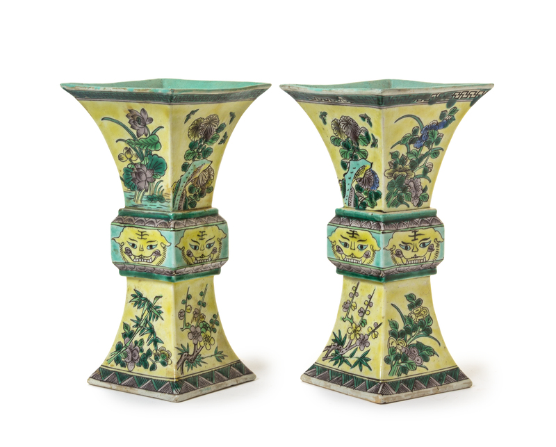 A Pair of Chinese Famille Verte Porcelain Gu -Form Vases