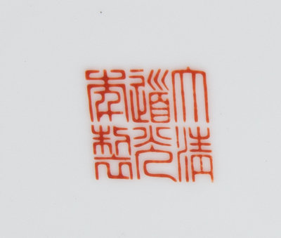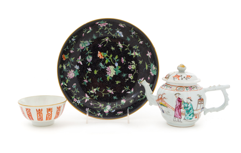 the first an iron red decorated bowl painted with various shou characters, bearing a Daoguang iron red four-character mark to the underside; the second a famille noire circular plate, the interior painted to depict peach branches, peony sprays, lychee branches and butterflies against a black ground, bearing a Daoguang iron red six-character mark to the underside; the third a Chinese export famille rose teapot painted with a couple in an interior scene.