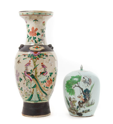the first an iron decorated crackled ground famille rose example painted with phoenix and peonies, the second a ginger jar with figural decoration.