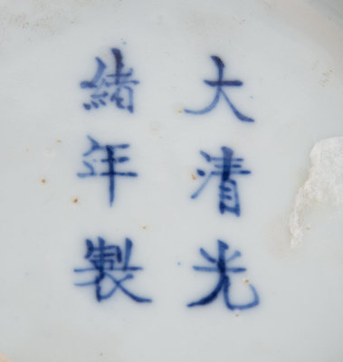 the first with floral decoration, the second bearing a Guangxu six-character underglaze blue mark.