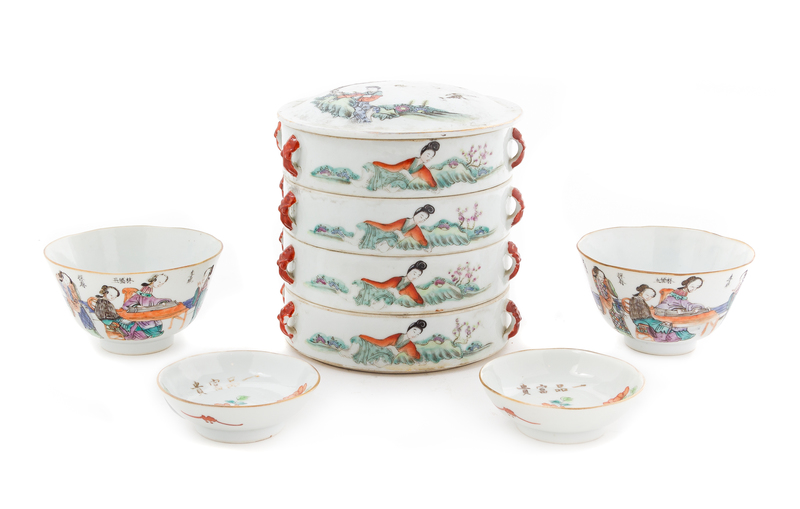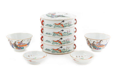 comprising a four-tier stacking box, a pair of teacups and a pair of small dishes.