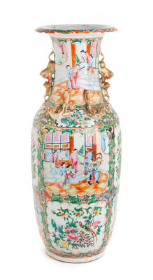 the cylindrical body painted with shaped reserves enclosing figures at various tasks and birds perched on flowering branches, the neck molded with a pair of gilt highlighted lion form handles.