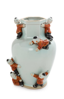 having a baluster body surmounted by a hexagonal form neck and mouth rim, the exterior molded with six figures of boys.