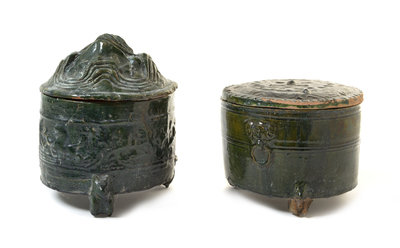 each of deep cylindrical form raised on three bear shaped feet, one jar with the main panel carved to show equestrian figures, the cover molded in the form of a mountain, the other decorated with concentric rings and set with a pair of mask-form handles and mock rings, having a flat cover carved to show a floral blossom.