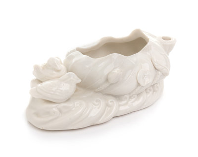 moulded as a large scrolled lotus leaf besies two birds above waves.